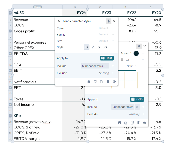 Another frequent scenario arises when you need certain parts of your Visual Grid to stand out from the rest—such as emphasizing subtotals in a Profit & Loss-table with bold text and borders.