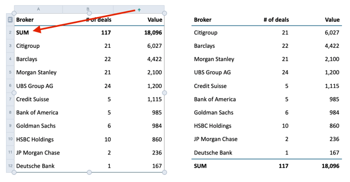 In this example, the SUM-row ends up moved to the top when sorted descending because it has not been defined as Footer-type. On the right is the same example with the SUM-row defined as Footer.