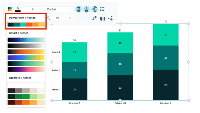 When inserting a chart or other graphic from the Grunt library, Grunt will automatically pull in the Theme Colors from your currently active theme to populate the graph with theme-appropriate colors.