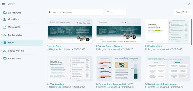 By uploading to your company space in the Grunt Library, your teammates and others in the company will have access to frequently used templates and other objects making your everyday work with presentations more streamlined and enjoyable.