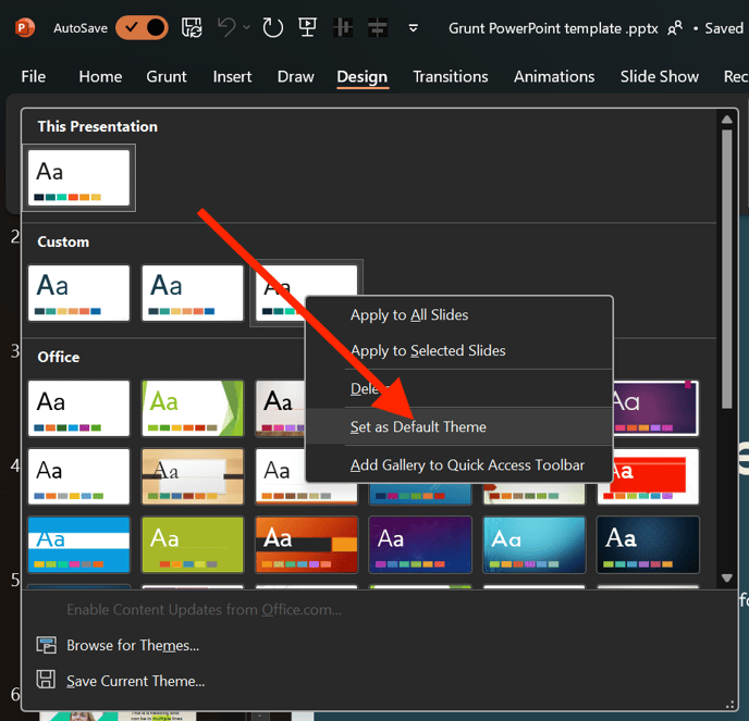 - Open the Design-tab and expand the view again, find the theme you just saved under the "Custom"-section, right click and choose "Set as Default Theme."