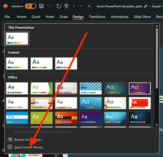 - Open the Design-tab in PowerPoint and expand the view. Click "Save Current Theme.." and give it a fitting name.